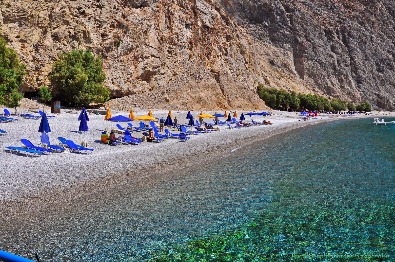 Μπήκε ο Σεπτέμβρης αλλά εγώ εξακολουθώ να σας δείχνω καλοκαιρινές φωτογραφίες από την Κρήτη. Σας είχα υποσχεθεί σε προηγούμενη ανάρτηση, να σας δείξω αυτήν την παραλία, κοντά στην Χώρα των Σφακίων. Είναι μοναδική και μπορεί να πάει κανείς εκεί μόνο με καραβάκι από τα Σφακιά ή ακολουθώντας ένα δύσκολο μονομάτι από το χωριό Λουτγρό των Σφακίων. Υπάρχουν μόνο μερικά δεντράκια και μια ταβέρνα, στο δυτικό άκρο της παραλίας, όπου μπορεί να πάρει κανείς ένα ποτό ή ένα ελαφρύ γεύμα. Πρέπει κανείς νάχει τις προμήθειές του αν την επισκεφθεί, επειδή μάλλον θα πάει για αρκετές ώρες.και ν' απολαύσει τα κρυστάλλινα νερά. Όσο για τ' όνομα της παραλίας, στην επόμενη ανάρτηση θα σας πω πώς δικαιολογείται.